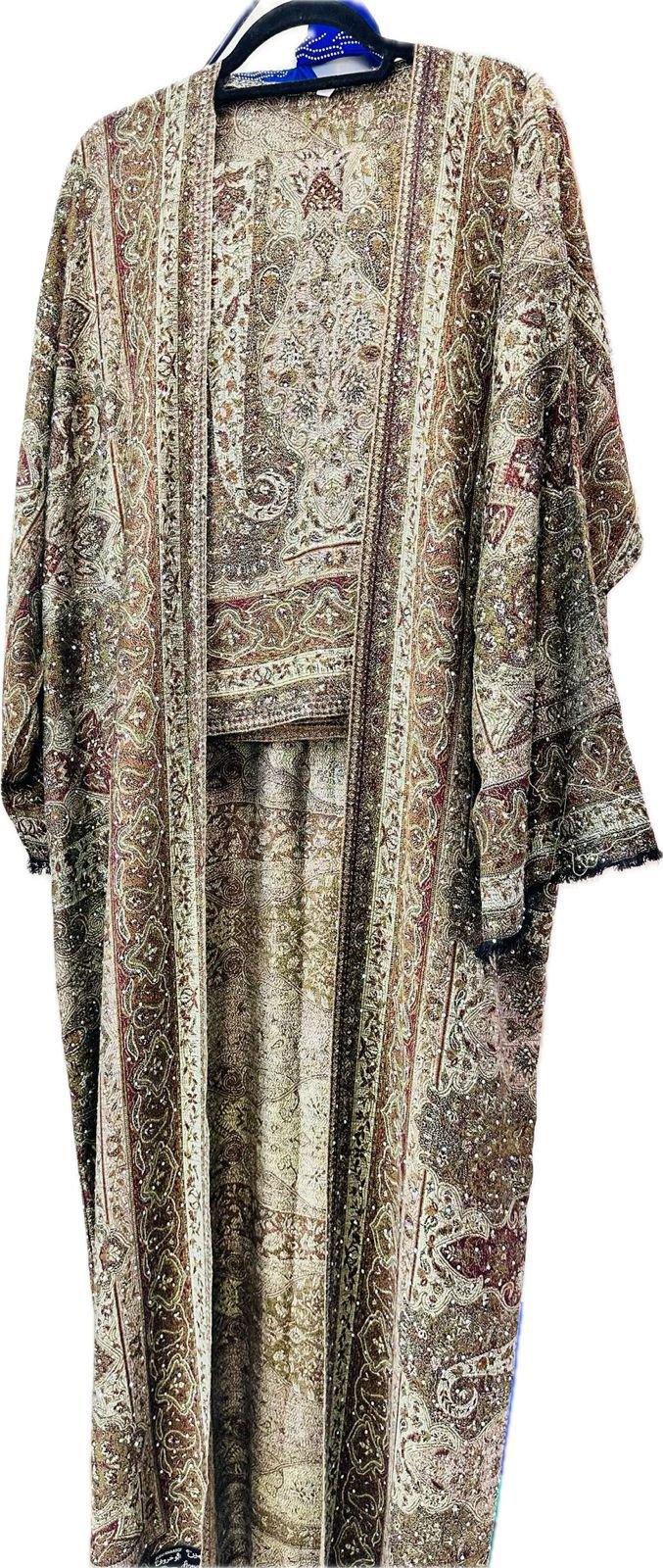 Cream Maroon Traditional Pashmina Abaya – A luxurious cream and maroon pashmina shawl abaya with intricate traditional patterns and sparkling MC full stone work. Comes with matching inner, headscarf, and belt. Ideal for Ramadan and special occasions.