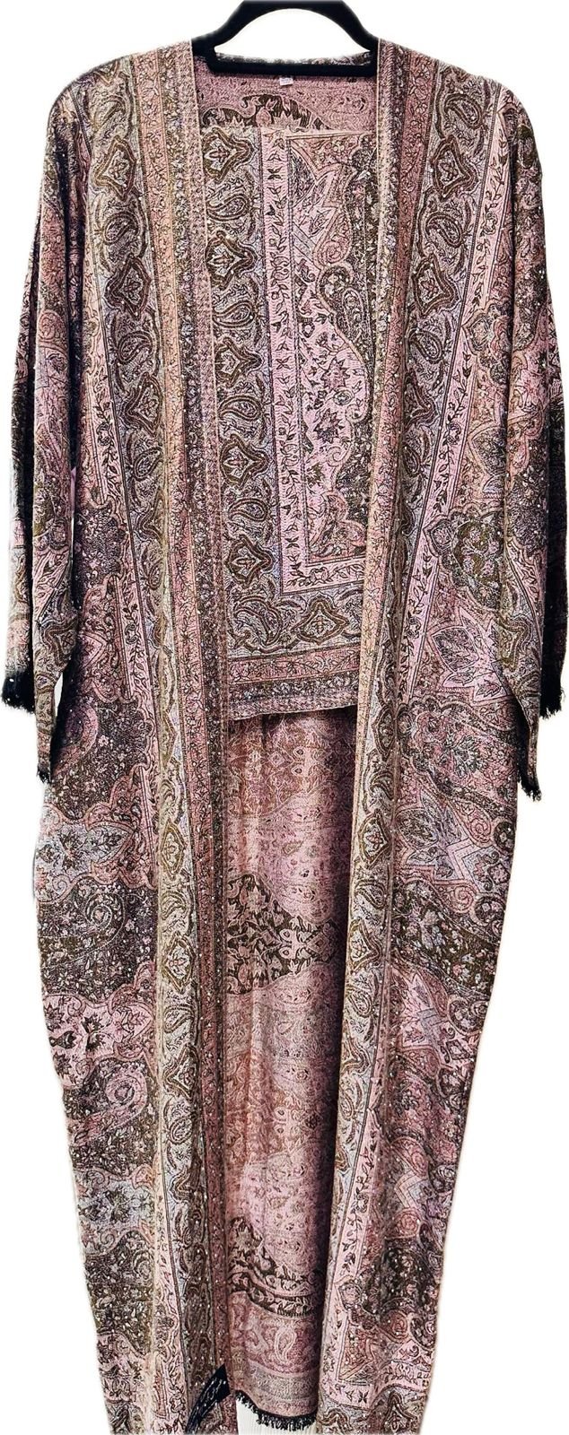 Dusty Rose Classic Pashmina Abaya – A graceful dusty rose pashmina shawl abaya featuring traditional paisley border prints and MC full stone work. Includes matching inner, headscarf, and belt. Suitable for daily wear, office wear, and Ramadan.