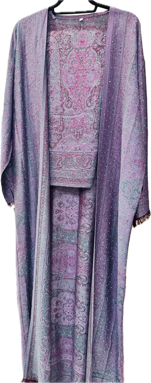 Lavender Pink Paisley Pashmina Abaya – A beautifully crafted pashmina shawl abaya featuring an intricate lavender and pink paisley design with sparkling MC full stone work. Comes with matching inner, headscarf, and belt. Perfect for daily wear, office wear, Ramadan, and casual use.