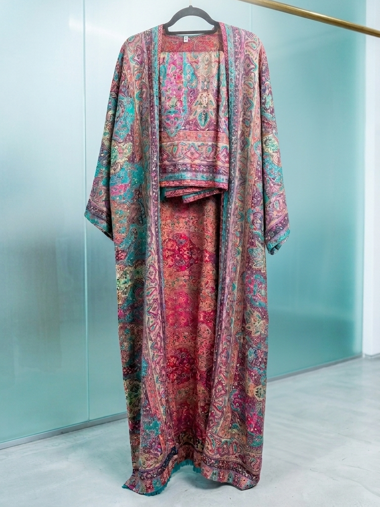 Embrace the Art of Traditional Craftsmanship Part of our exclusive Kashmir Collection, this handwoven kimono is a masterpiece of textile design. Inspired by heritage motifs and updated for the modern woman, it features a rich palette of deep rose, teal, and amber.